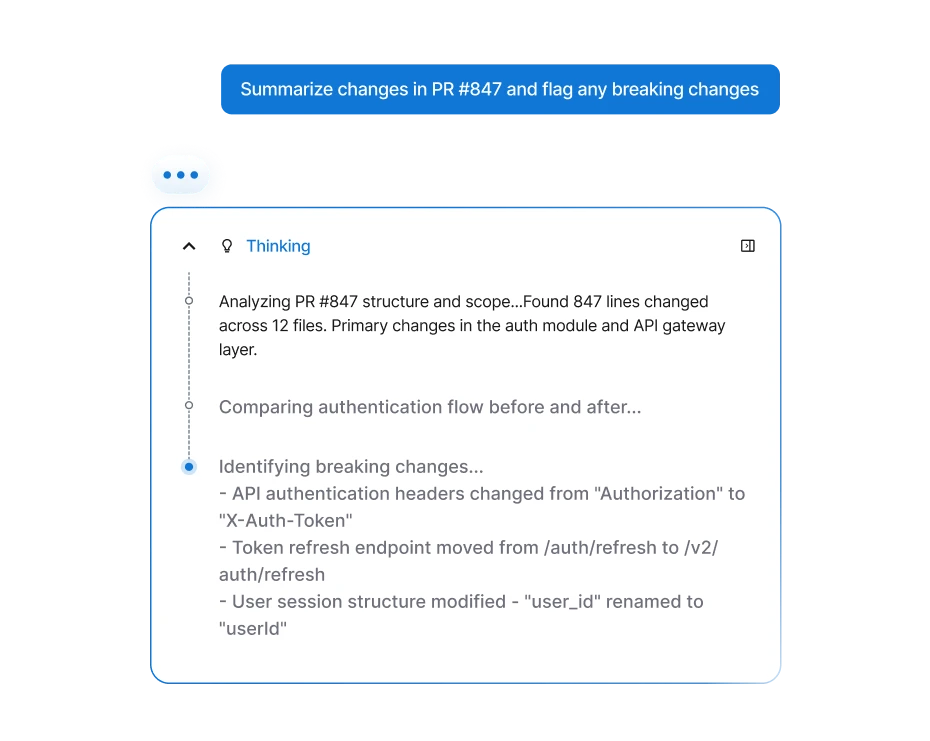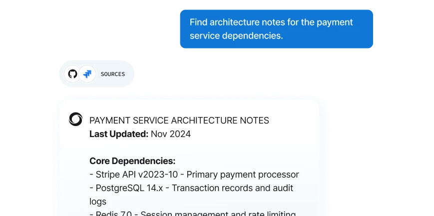 Surface code snippets, past fixes, architecture notes, and dependencies across code repositories, tickets, documentation, CI/CD systems, and more (i.e., GitHub, Jira, Confluence) in a single view, so engineers spend less time searching and more time shipping.