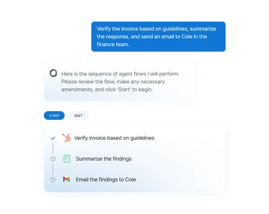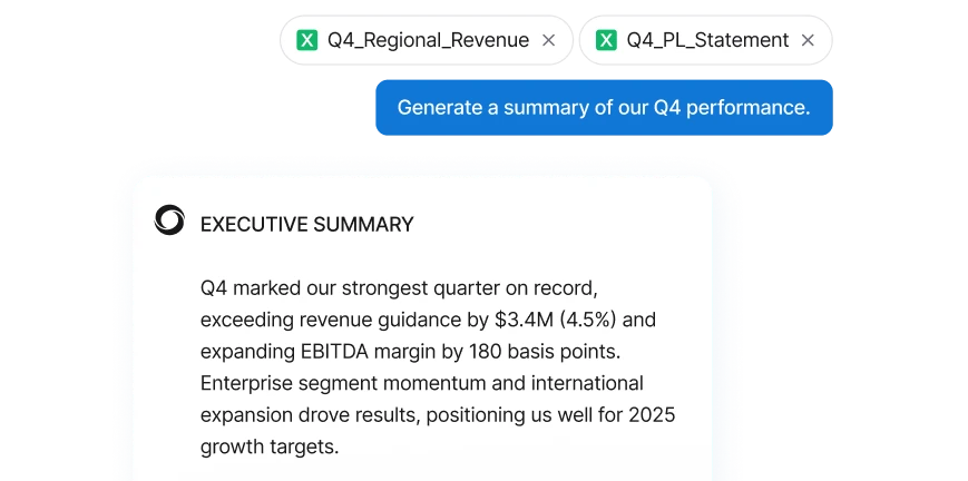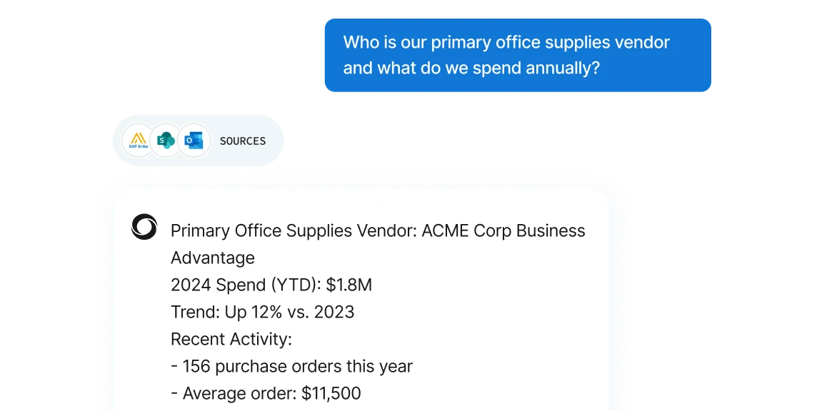 Find policies, audit notes, financial models, and other financial insights using a single interface across ERP, FP&A, order-to-cash, document management systems, and more, enabling teams to respond faster, reduce manual work, and deliver confident insights to stakeholders.