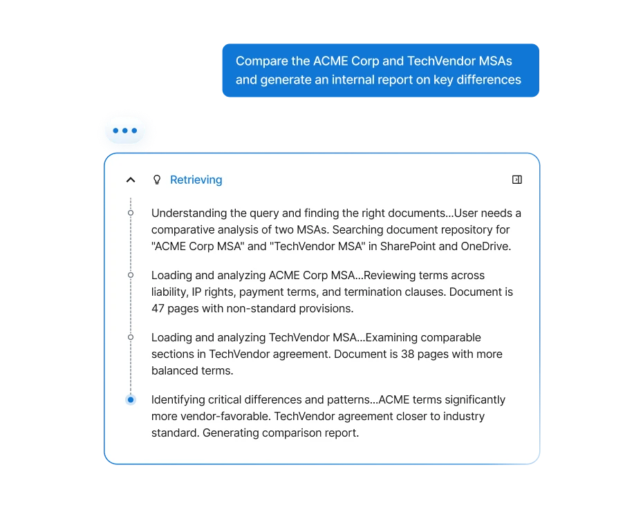 Search and summarize contracts, filings, emails, and policy documents across iManage, DMS, CLM platforms, SharePoint, and more, helping legal teams to complete research faster and support decisions with confidence.