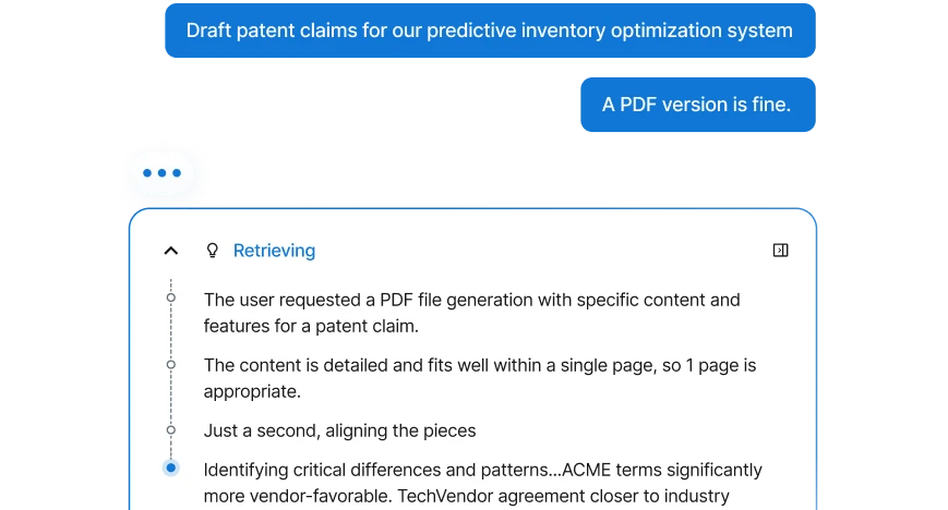 Produce patent claims, internal memos, and response drafts that accelerate document preparation and reduce drafting overhead, freeing legal teams to focus on strategic counsel.