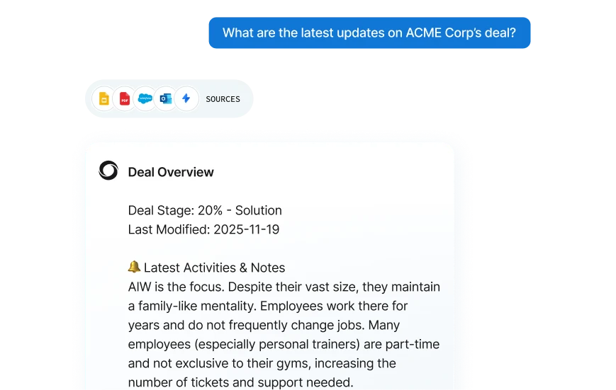 Surface customer insights in a single view so your sales teams quickly understand deal context, buyer priorities, and recommended actions by unifying data from CRM, email, chat, EPR, and more (i.e., SalesforceMicrosoft OutlookSAP), with on-the go access to eliminate switching between applications and move opportunities forward.